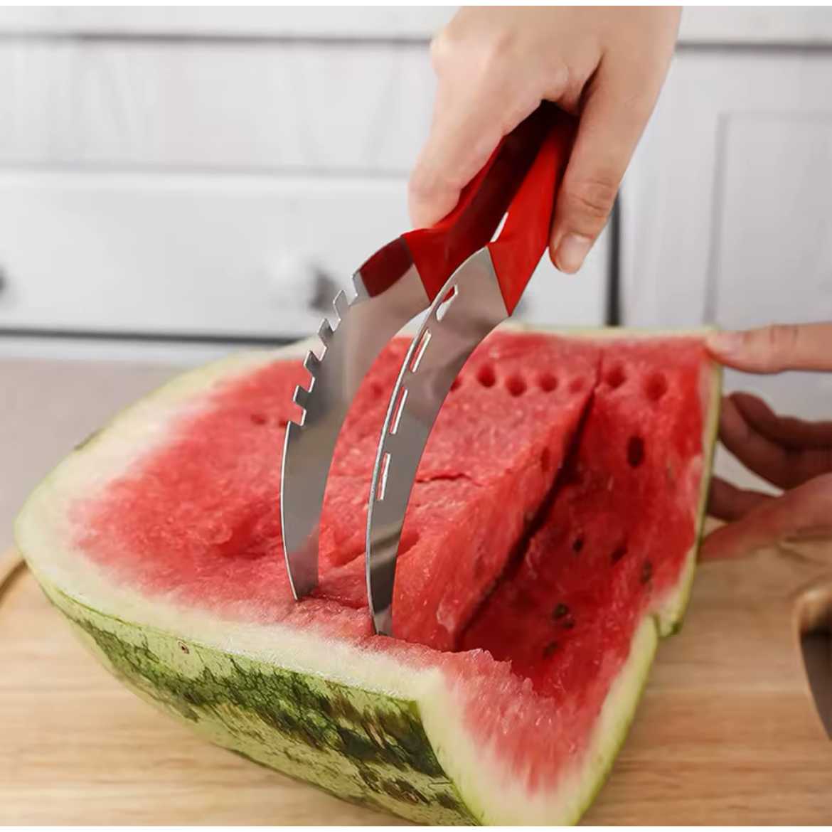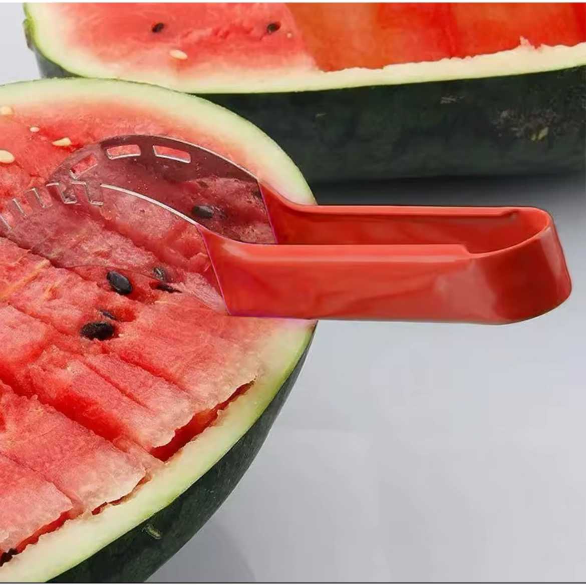 watermelon slicer server, you can cut directly from the rind, collecting all the juice in the rind like a bowl. Slice your watermelon in half the time, ideal for making smoothies or fruit salads.