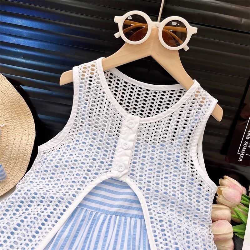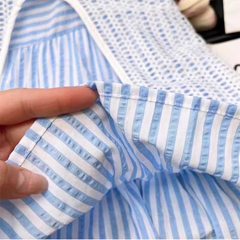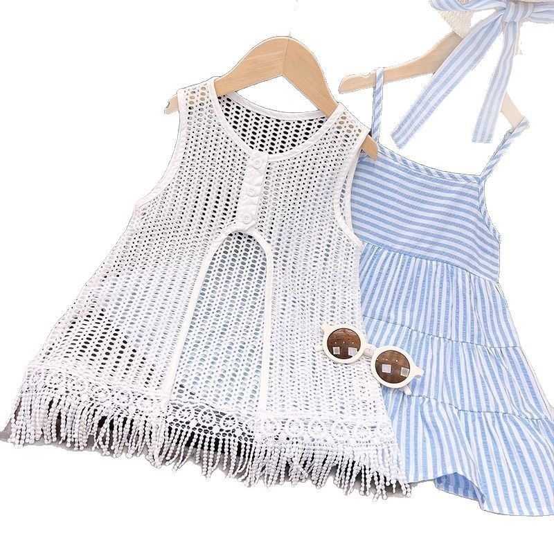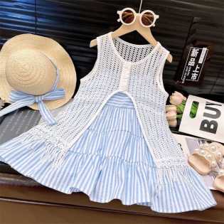 Girls Hollow Tassel Cardigan Striped Suspender Skirt Two-piece Set